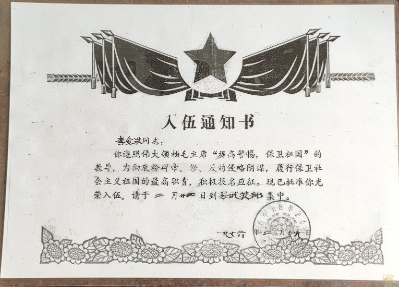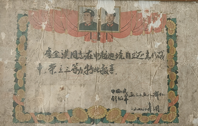 1976年2月,李金洪(第一排右二)春季應(yīng)征入伍大合照 炮火洗禮,浴血奮戰(zhàn) 1979年2月17日,天還未亮,中越邊境線上萬(wàn)炮齊發(fā),漆黑的天空霎時(shí)被炮火染紅。震耳欲聾的炮火聲、沖鋒陷陣的吶喊聲如同驚雷般在李金洪耳邊炸響,令他熱血沸騰,一片空白的腦海瞬間被浴血?dú)场Z取勝利的斗志填滿(mǎn)。 這是李金洪作為53258部隊(duì)尖刀班機(jī)槍手參加1979年對(duì)越自衛(wèi)反擊戰(zhàn)的記憶。當(dāng)時(shí),尖刀班肩負(fù)著沖在隊(duì)伍最前方、為主力部隊(duì)擋下槍炮等最為急難險(xiǎn)重的任務(wù)。 從2月17日到3月16日,從靠松山到三埡口,在持續(xù)一個(gè)月的山地戰(zhàn)爭(zhēng)中,李金洪和戰(zhàn)友們每天僅靠吃干糧野果、喝河水充饑,整整一個(gè)月的時(shí)間里衣服干了又濕,濕了又干,有時(shí)受傷之后,傷口和衣服都粘在一起,疼痛無(wú)比。當(dāng)時(shí)雖然又累又困,但是戰(zhàn)士們的眼睛始終都是保持睜開(kāi)的,因?yàn)閿橙穗S時(shí)都會(huì)出現(xiàn)在附近,瞬間就是你死我活的戰(zhàn)場(chǎng)。就這樣,李金洪一直以堅(jiān)定信念和頑強(qiáng)精神在戰(zhàn)場(chǎng)殺敵,直到戰(zhàn)爭(zhēng)結(jié)束。 生死一瞬間,火線立軍功 1979年3月10日,尖刀班接到了去三埡口搜山的任務(wù),突然與敵軍遭遇,當(dāng)時(shí)尖刀班只配備了一挺機(jī)槍?zhuān)罱鸷榫褪菣C(jī)槍手,當(dāng)時(shí)由于地形對(duì)我方不利,不便發(fā)動(dòng)火力打擊和進(jìn)行蔭蔽工作。這時(shí),班長(zhǎng)一邊指揮2名戰(zhàn)士立即下山給后方的大部隊(duì)報(bào)信,一邊組織全班沉著埋伏,等待敵人靠近。 當(dāng)敵人離陣地只有幾米時(shí),作為班里唯一機(jī)槍手的李金洪突然挺起機(jī)槍準(zhǔn)備開(kāi)火,敵軍看到機(jī)槍慌亂朝他射擊,李金洪迅速閃躲,避開(kāi)飛來(lái)的子彈,隨即向敵人開(kāi)火,首發(fā)即擊斃領(lǐng)頭敵軍,并成功搶占有利地形,用猛烈的火力掩護(hù)全班戰(zhàn)斗,敵人四處逃竄。 僅用半小時(shí),尖刀班就消滅了4名敵人、俘虜1名,繳獲半自動(dòng)步槍2支,并且全班無(wú)一人員傷亡,打下一場(chǎng)漂亮的伏擊戰(zhàn)??克缮?、東溪、高平、茶靈、廣淵、下瑯……對(duì)越自衛(wèi)反擊戰(zhàn)期間,李金洪保家衛(wèi)國(guó)浴血奮戰(zhàn),出色地完成了上級(jí)交給的護(hù)衛(wèi)和戰(zhàn)斗任務(wù),榮立個(gè)人三等功1次。