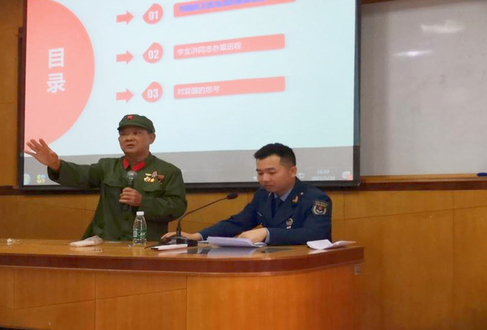 戰(zhàn)后李金洪(第四排左四)與全連戰(zhàn)友合影 愛(ài)國(guó)主義教育的紅旗志愿者 無(wú)論是在戰(zhàn)場(chǎng)上還是在和平年代,無(wú)論是身在部隊(duì)還是脫下軍裝,李金洪都始終保持著軍人的作風(fēng),也始終堅(jiān)守著忠于祖國(guó)、熱愛(ài)人民的精神信仰。李金洪不忘初心、牢記使命,用實(shí)際行動(dòng)詮釋了“退伍不褪色、退役不退志、離軍不離黨”的退役軍人品質(zhì)。 在建黨100周年舉國(guó)同歡的日子里,李金洪受邀參加神灣鎮(zhèn)“老黨員講黨史,憶崢嶸感黨恩”主題活動(dòng)?;顒?dòng)上,李金洪以“我和我的祖國(guó)”為題與神灣中學(xué)915名師生共同回憶1979年那段崢嶸歲月,講述了為捍衛(wèi)國(guó)家和人民利益而進(jìn)行的無(wú)畏戰(zhàn)斗,在場(chǎng)師生無(wú)不為之動(dòng)容,深感到今日幸福生活來(lái)之不易。 由于身體患病,李金洪說(shuō)起話來(lái)不是很連貫,甚至不能長(zhǎng)時(shí)間說(shuō)話。但他義無(wú)反顧的接受邀請(qǐng),成為愛(ài)國(guó)主義教育的紅旗志愿者,目的是為了讓年輕一代更加熱愛(ài)祖國(guó)、熱愛(ài)人民和熱愛(ài)生活。