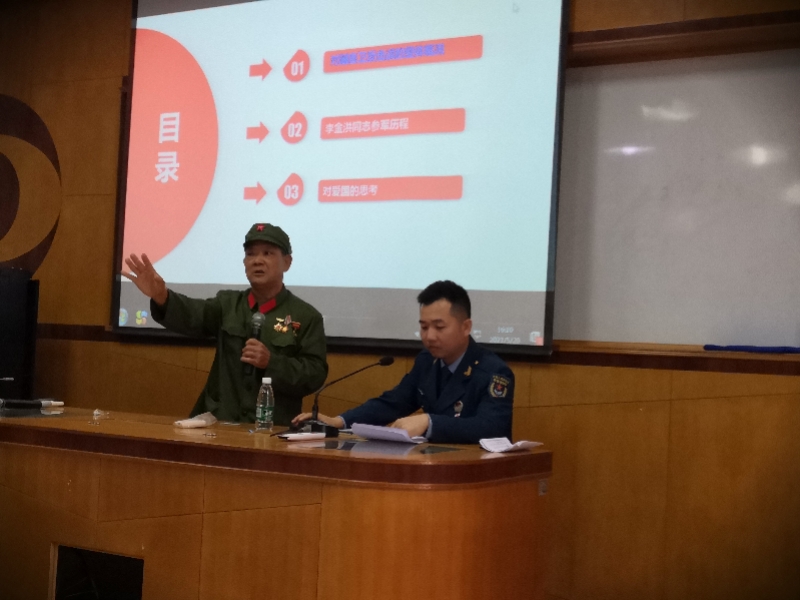 李金洪與陳偉樂兩代退役軍人同臺講述崢嶸歲月。 由于身體不適,李金洪無法長時間親述那段崢嶸歲月,但是這位老兵又是那么熱心地想讓更多后輩知道祖國的不容易,人民當今幸福生活的來之不易,毅然接受邀請,克服身體不適,再次走上講臺,結(jié)合親身經(jīng)歷給在場師生講述1979年那段崢嶸歲月。李金洪表示,軍人的使命是保衛(wèi)祖國,抵抗侵略,“如果再給我選擇的機會,我還是義無反顧上戰(zhàn)場,我們有偉大的共產(chǎn)黨、有偉大的制度、有偉大的祖國和人民,我們應該為自己是一名中國人和生活在祖國的大地上感到驕傲和自豪”。 此次宣講活動中,李金洪多了一個戰(zhàn)友,他叫陳偉樂,是駐香港部隊的退役軍人,也是神灣鎮(zhèn)退役軍人服務中心的工作人員,李金洪和陳偉樂雖然是不同時代的退役軍人,但是有著同一個方向,就是對黨、祖國和人民無限的愛。李金洪身體不適,陳偉樂就來充當他的“傳聲筒”,將一段段難忘經(jīng)歷分享給廣大師生們。