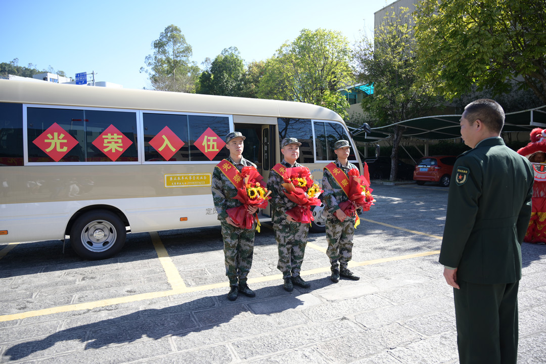 葉陽浩、胡家威兩名準(zhǔn)新兵身披“光榮入伍”的紅色綬帶和大紅花昂首挺胸站在太陽下,新兵家屬前來歡送。“陽浩的堂叔叔、外公和叔公都曾應(yīng)征入伍,他能進部隊得到鍛煉,我們作為他的父母感到很光榮、很幸福?!比~陽浩的父母胸戴“光榮家屬”的大紅花,露出激動的笑容。