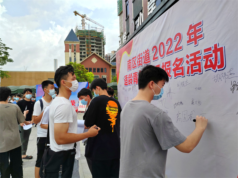 體檢現(xiàn)場,南區(qū)街道嚴(yán)格按照標(biāo)準(zhǔn)設(shè)置,通過懸掛征兵標(biāo)語、張貼海報、使用LED屏播放征兵宣傳片等方式,營造濃厚氛圍。事前,南區(qū)街道征兵辦嚴(yán)格落實常態(tài)化疫情防控要求,提前收集、核查好參檢青年的粵康碼、行程卡、核酸檢測證明等,并對體檢場所進行全面消毒處理,保持體檢站分離通風(fēng)。參檢人員全程佩戴口罩,分批分流進行體檢,確保體檢工作平穩(wěn)有序開展。  ▲適齡青年參加體檢簽名