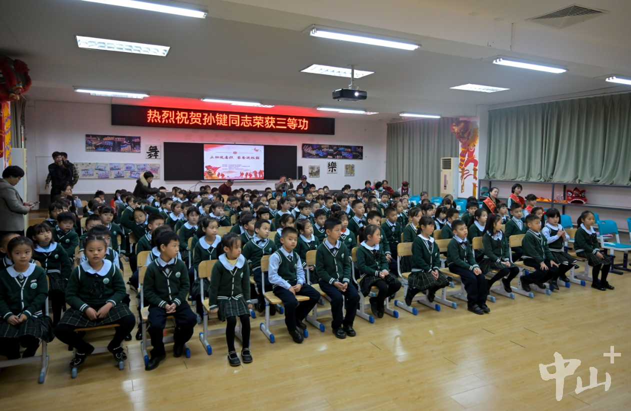 拉橫幅、敲鑼鼓、舞龍獅……2月29日一早,東區(qū)街道竹苑社區(qū)迎來了一支敲鑼打鼓、舞龍舞獅的隊(duì)伍,一路喜氣洋洋,熱鬧非凡。游行隊(duì)伍將一份立功受獎(jiǎng)的榮譽(yù),帶到了榮立三等功的現(xiàn)役軍人孫鍵女兒孫頌雅所在的竹苑小學(xué),熱鬧的場(chǎng)面吸引許多鄉(xiāng)親、商戶等前來圍觀祝賀。 聯(lián)合送喜報(bào),儀式感拉滿 校園內(nèi),在讀小學(xué)一年級(jí)的“軍娃”孫頌雅和她的同學(xué)、老師等共同見證了這一榮耀時(shí)刻。東區(qū)街道黨工委書記周俊峰將三等功喜報(bào)送到孫頌雅一家人手上,市退役軍人事務(wù)局黨組成員、副局長(zhǎng)陳光林為他們送上慰問金,并為其佩戴光榮綬帶“一人立功,全家光榮”,一家人臉上洋溢著開心且自豪的笑容。  孫頌雅一家人在學(xué)校收到立功喜報(bào)。記者 易承樂 攝