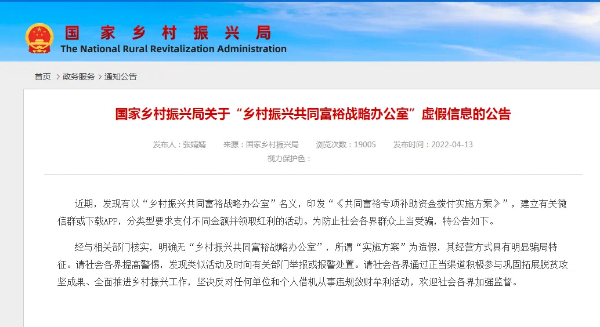 記者還了解到,2022年4月份國家鄉(xiāng)村振興局就在官網(wǎng)上發(fā)布相關(guān)辟謠聲明,并提醒社會各界群眾應提高警惕注意防范,發(fā)現(xiàn)類似活動及時向有關(guān)部門舉報或報警處置。