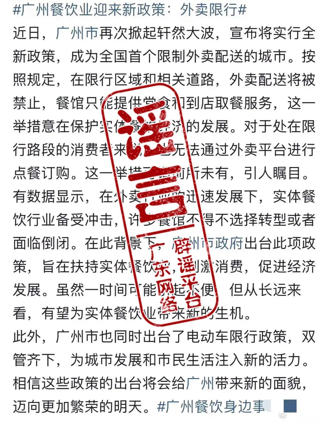 近日,有自媒體發(fā)布“廣州市將實行全新政策,成為全國首個限制外賣配送的城市”“限行區(qū)域和相關(guān)道路,外賣配送將被禁止,餐館只能提供堂食和到店取餐服務(wù)”,經(jīng)核查,上述信息嚴重不實,惡意曲解廣州電動自行車限行新規(guī),誤導民眾,引發(fā)不良社會影響。