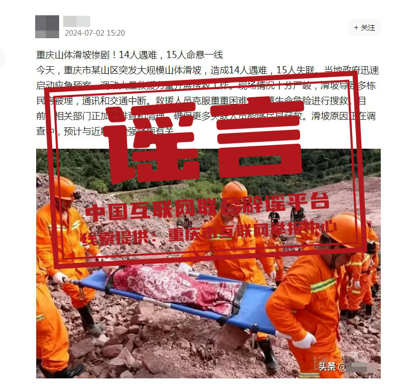 真相:7月2日,某網(wǎng)民發(fā)布信息稱,“重慶市某山區(qū)突發(fā)大規(guī)模山體滑坡,造成14人遇難,15人失聯(lián)?!苯?jīng)相關(guān)部門核實(shí),重慶近日未發(fā)生相關(guān)地質(zhì)災(zāi)害,網(wǎng)傳信息系謠言。(來源:重慶辟謠)