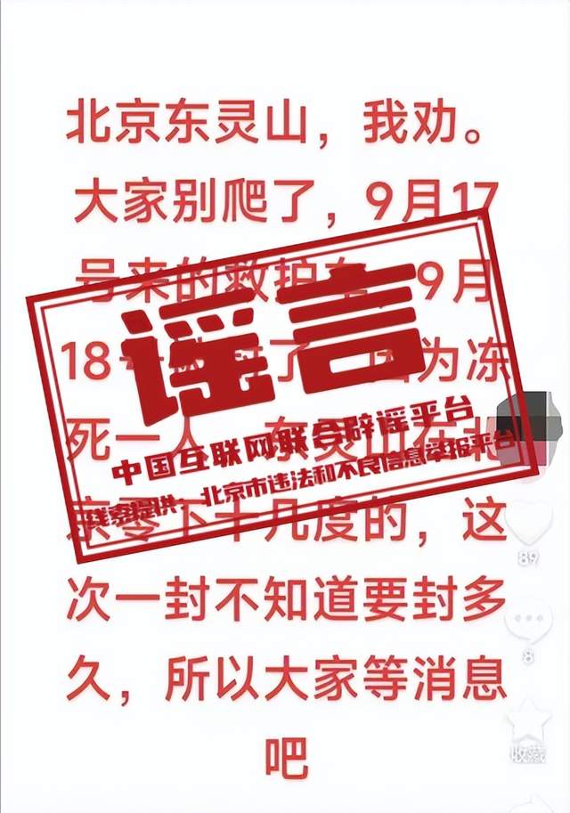 真相:近日,一則東靈山被“封山”的消息在網(wǎng)上流傳,有網(wǎng)友稱“封山”的原因是“有人夜爬時(shí)被凍死”,還有網(wǎng)友稱是“有人在山上被蛇咬”。經(jīng)北京市門頭溝區(qū)清水鎮(zhèn)政府、區(qū)文旅局等有關(guān)部門核實(shí),上述信息均為謠言。
